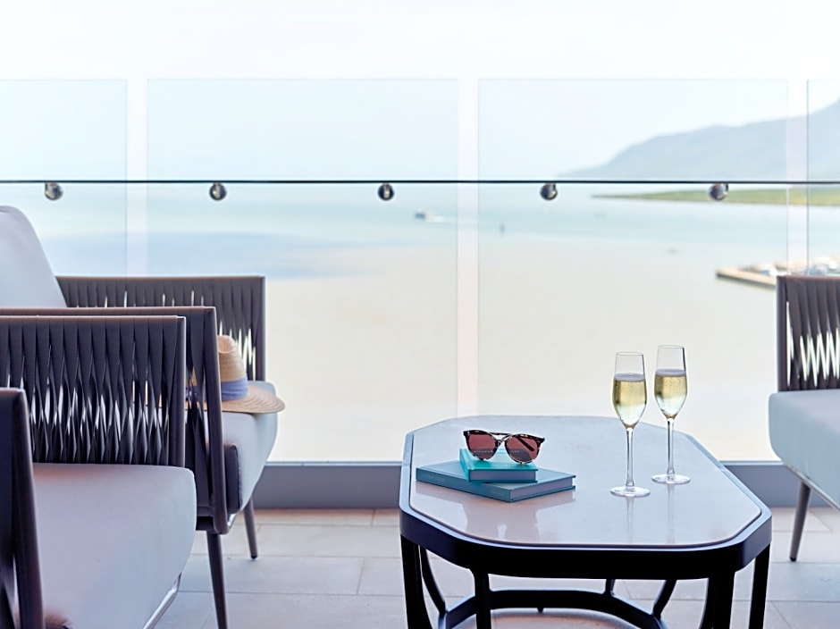 Sea suite one-bedroom is 646 square feet and includes a king-size bed 150-183 width plus desk, satellite tv , hairdryer, tea and coffee making facilities , ironing set, bathrobes, and slippers.